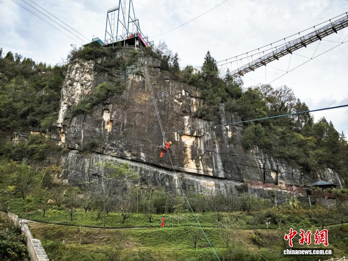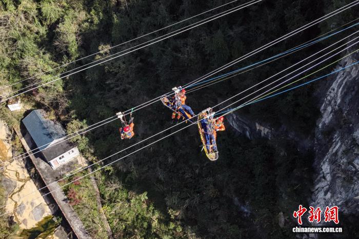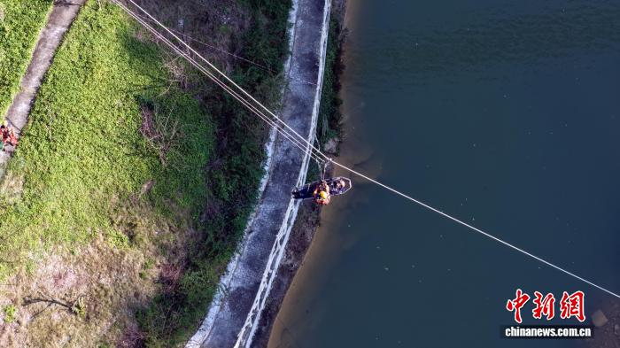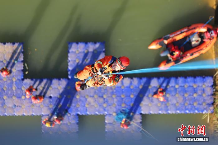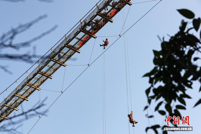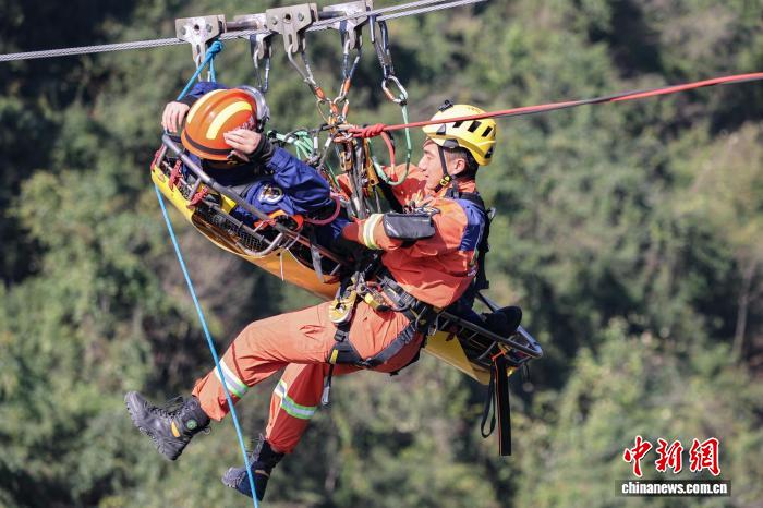图为消防职员正在地面中哄骗绳子赈济体系转运“被困者”。袁唐伟 摄