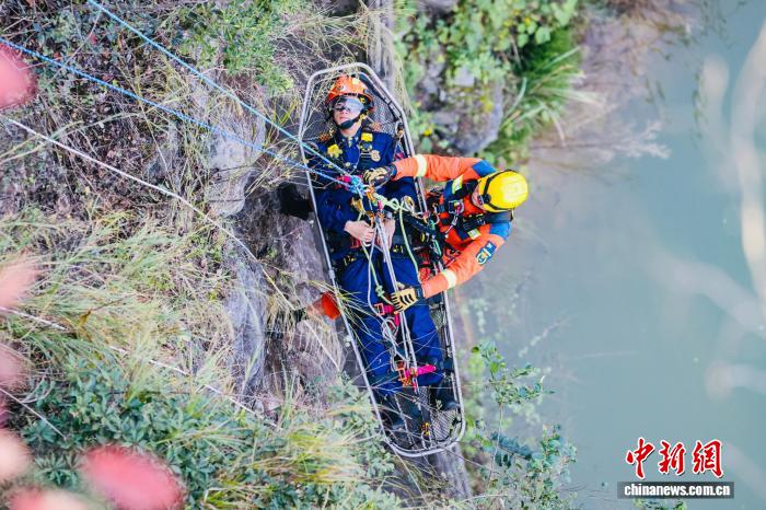图为消防职员正在地面中哄骗绳子拯救体系转运“被困者”。杨璇 摄